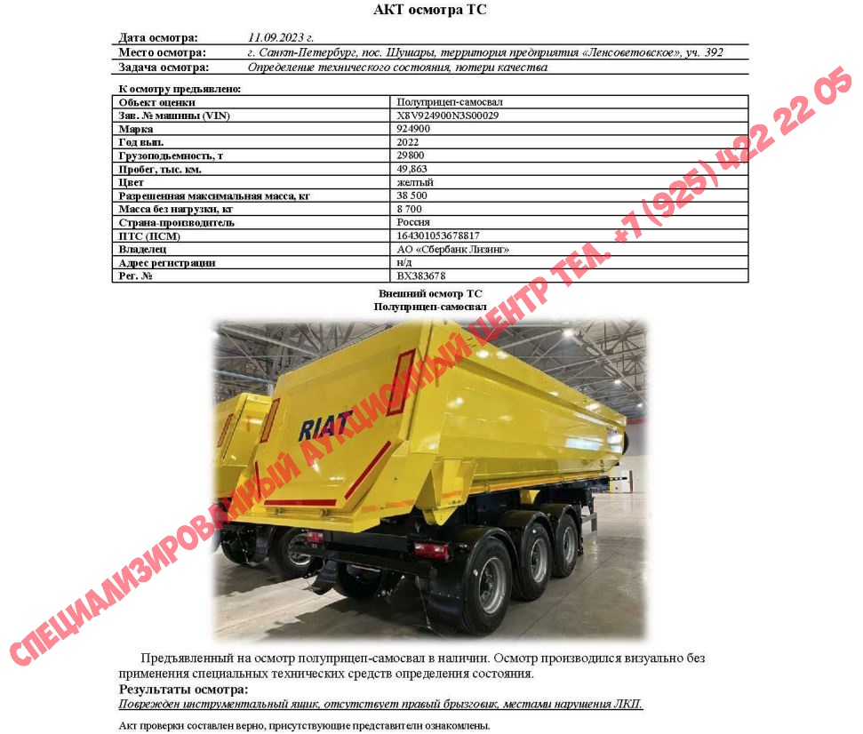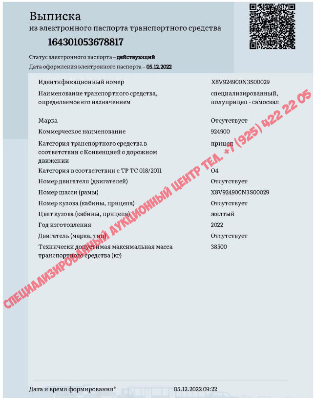 Специализированный, полуприцеп - самосвал 924900, 2022, Идентификационный номер: X8V924900N3S00029. Начальная цена продажи: 2348250 рублей 00 копеек, в том числе НДС 20%.