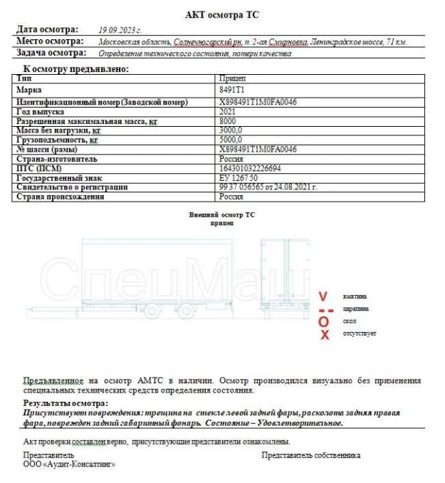 Прицеп 8491Т1, идентификационный номер: X898491T1M0FA0046, год выпуска: 2021. Техническое состояние: удовлетворительное. Местонахождение: Московская область, Солнечногорский р-н, п. 2-ая Смирновка, Ленинградское шоссе, 71 км.