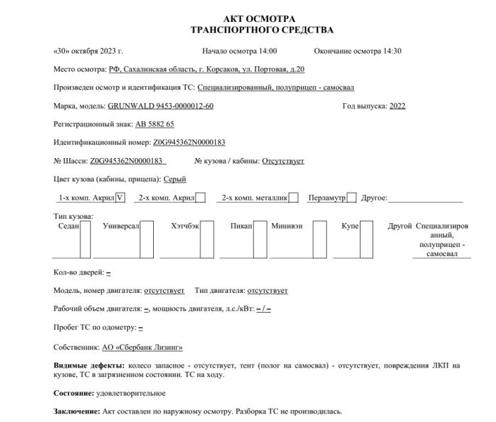 Полуприцеп - самосвал GRUNWALD, идентификационный номер: Z0G945362N0000183, год выпуска: 2022. Техническое состояние: удовлетворительное. Местонахождение: Сахалинская область, г. Корсаков, ул. Портовая, д.20